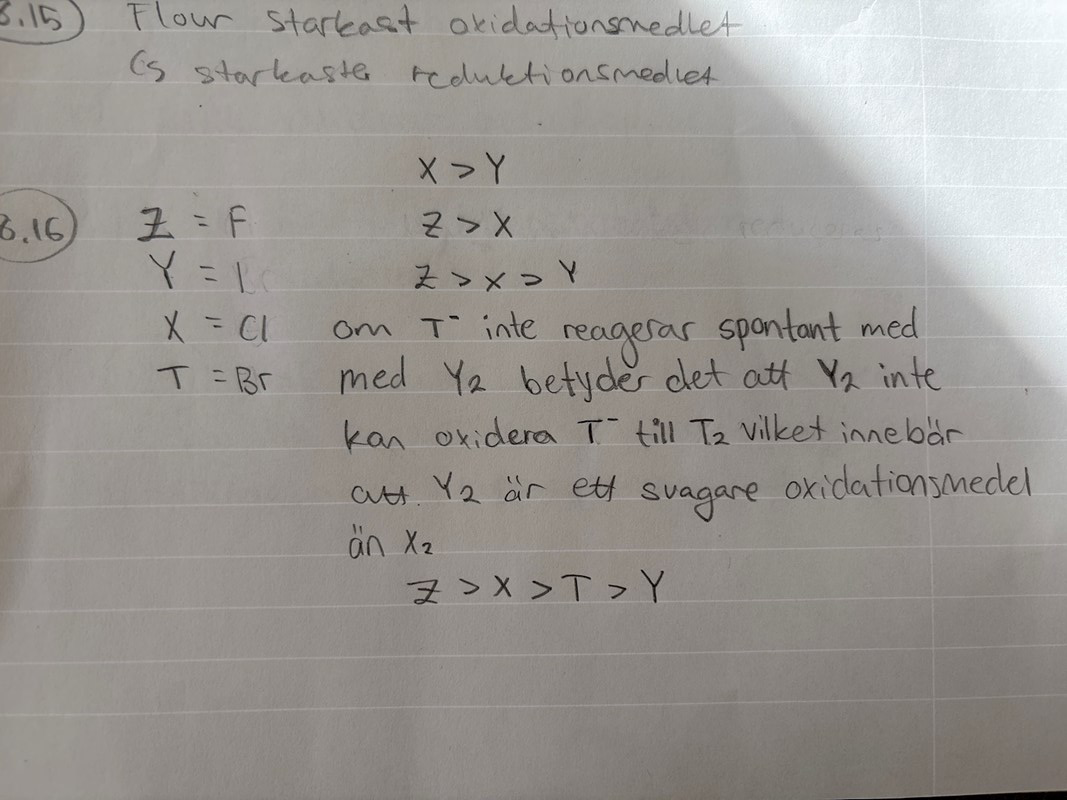Ja då vet jag att x är högre upp i periodiska systemet och z är högre än x. Men vad betyder det egentligen att jonen T- inte reagerar spontant med ämnet Y2. Vad säger det om hur starka oxidationsmedel de är?