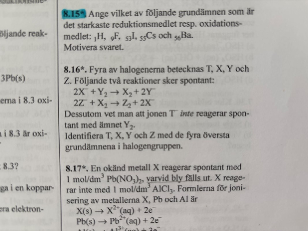 det är lugnt. vet du hur man löser8.16? jag förstår inte helt hur jag ska tolka att T- inte reagerar spontant med Y2