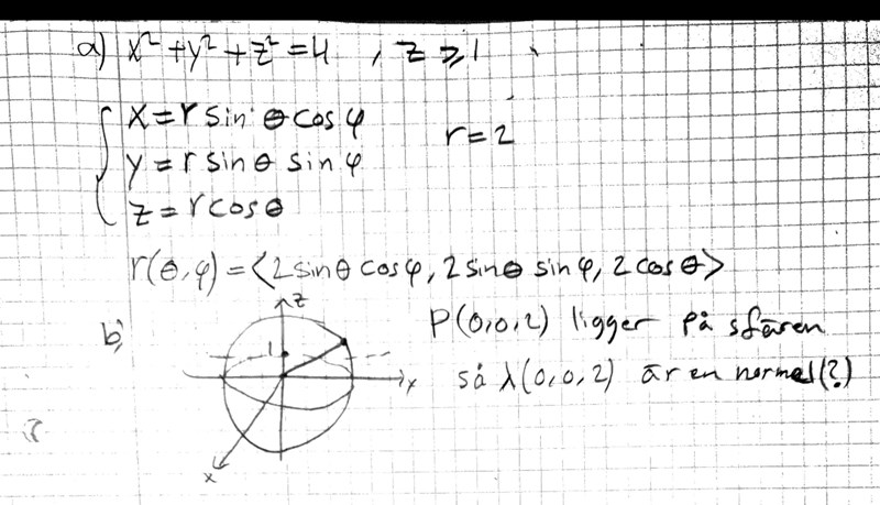 PATENTERAMERA skrev:Tänk dig en sfär med centrum i origo. I en punkt på sfären med orstvektor så är en normalvektor alltid parallell med ortsvektorn (rita). Dvs är en allmän normalvektor i punkten med ortsvektor på sfären. Så något verkar inte riktigt stämma i din uträkning.