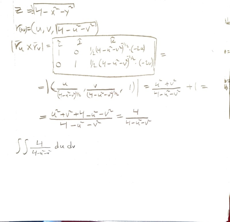 Notera att man vill att du skall beräkna arean. Så om om du valt parametrar u och v så lönar det sig att beräkna , eftersom ett infinitesimalt ytelement dS ges av