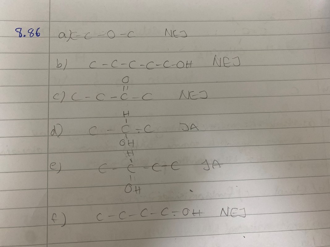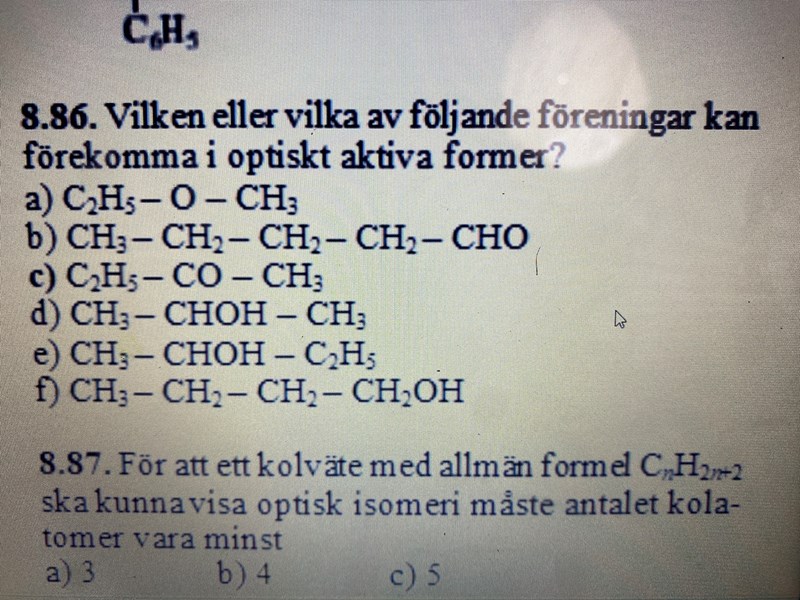 e) ja, 2-butanol finns i två olika stereoisomerer, så i teorin är var och en av dessa optiskt aktiva.
