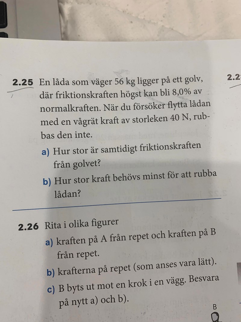 Jag förstår inte på 2,25 b) 8% av friktionslraft blir ju 0,92*549,92 men fom har tagit 0,08*549,92? Varför? Och sen undrar jag vad betyder ”rubbas inte”