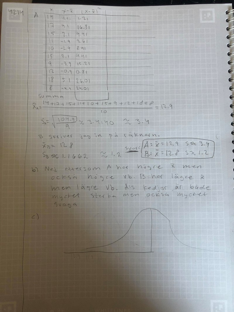 och hur jag löst a) och b), de ända jag gjort på c) är en normalfördelnings kurva: