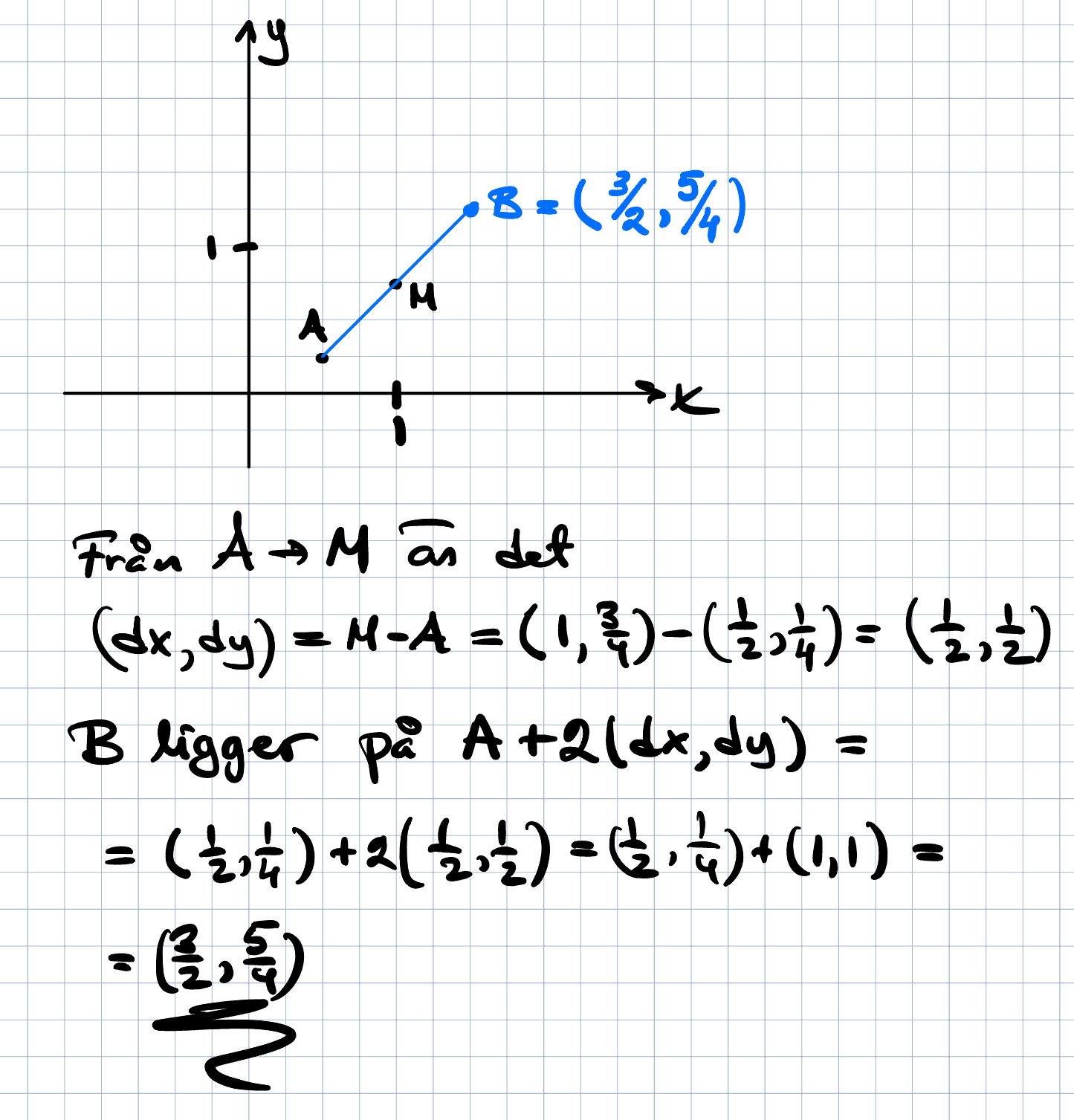 Om vi kallar x-koordinaterna för Ax, Bx och Mx samtidigt som vi kallar y-koordinaterna för Ay, By och My så borde det gälla att: