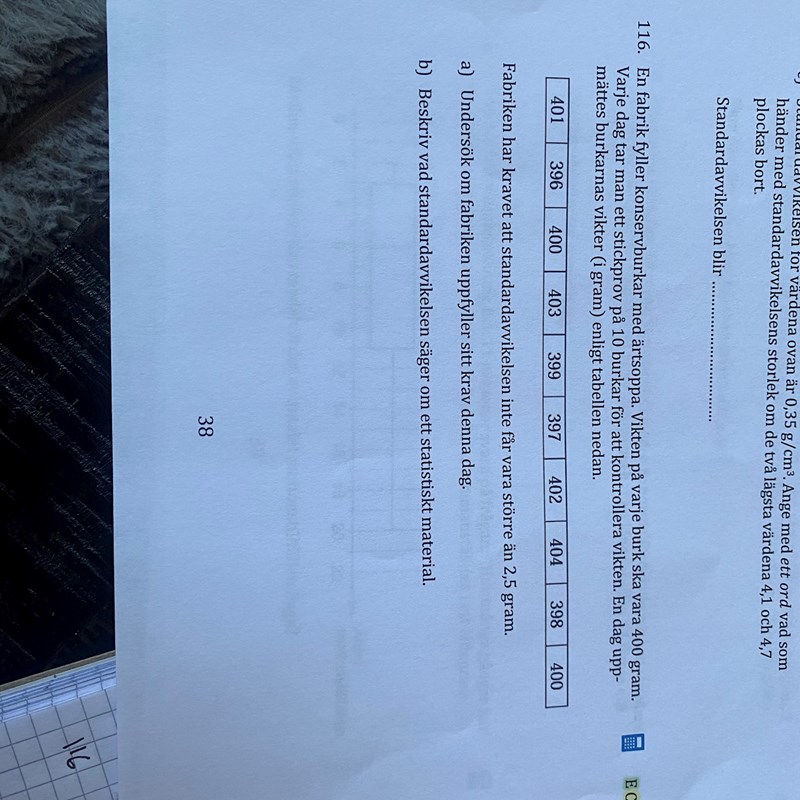 Standardavvikelse för en hel population och för stickprov skiljer sig en liten aning. Du har räknat som om företaget enbart gjorde tio burkar. I uppgiften står det att det är ett stickprov och det är ju också rimligt.