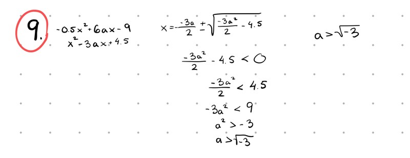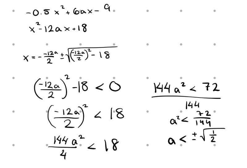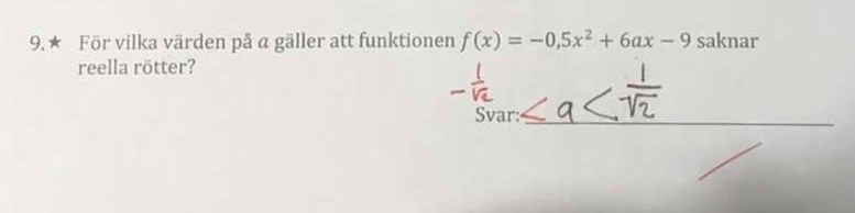 Du får diskriminanten som kan förenklas till . Diskriminanten är mindre än 0 om 36a2 < 18, d v s . Rita!