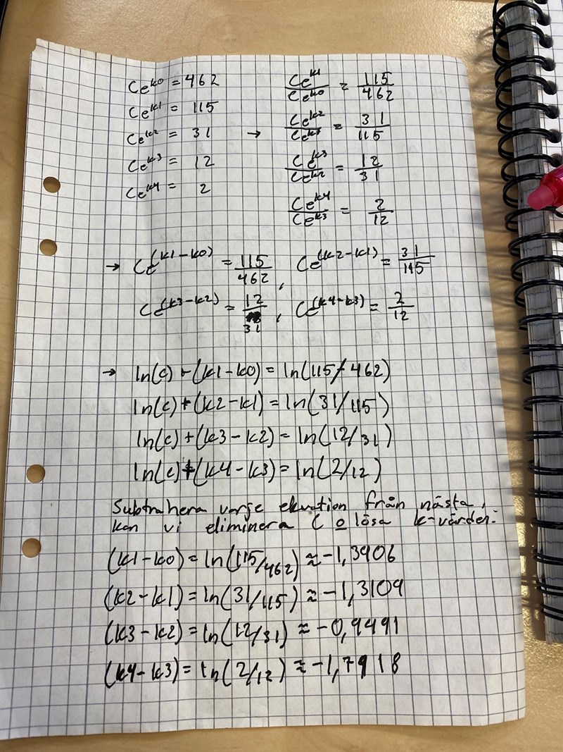 Sedan får du en tabell och då kan du använda något program du har tillgång till. Man kan göra linjär regression med en grafritande miniräknare, Excel, Google Sheets, R och en massa andra program. Då får du ut värden på k och ln(C), som du kan använda för att beräkna C.