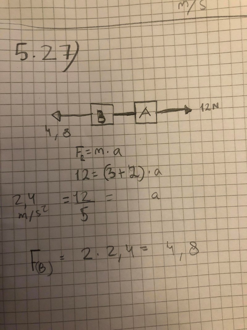 Kloss B dras åt höger med samma acceleration som kloss A. Alltså kraften är
