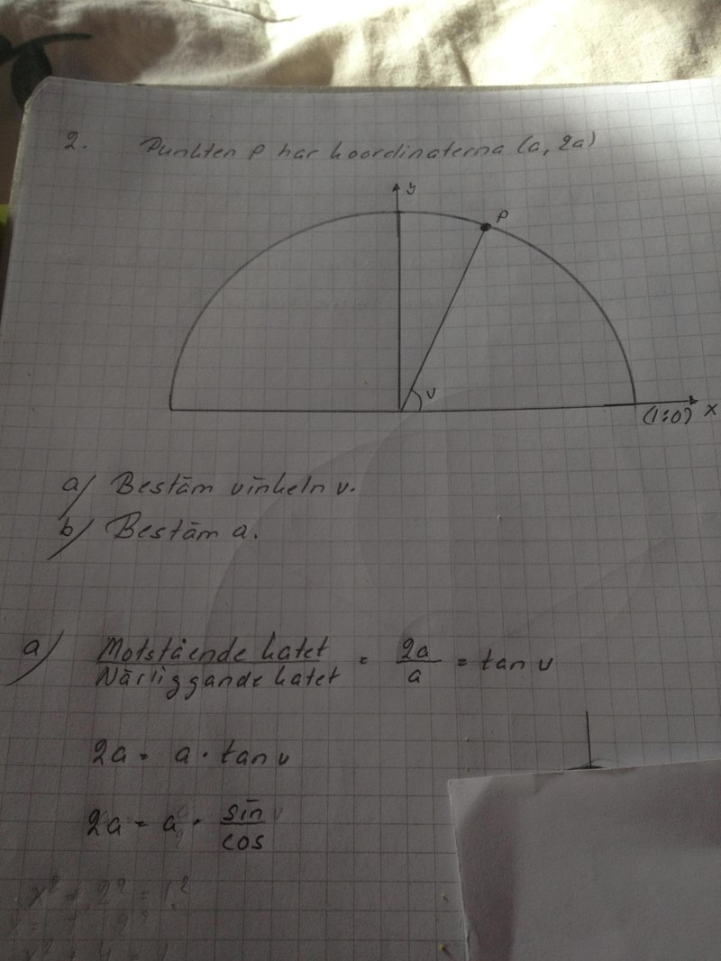 Jag började själv med pythagoras sats och provade. Jag var inne på samma tanken. Närliggande katet + motstående katet = hypotenusan i kvadrat allting.