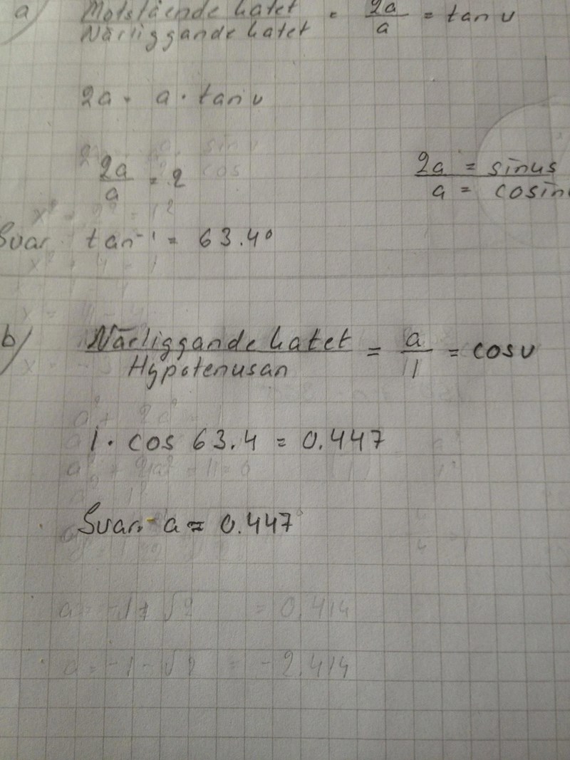 Ja, så kan du också göra, men tänk på att 63.4 endast är ett närmevärde till den riktiga vinkeln. Så vill man ha det exakta värdet på a så blir det bättre att använda pythagoras sats.