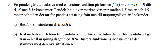 Det jag tänker skulle kunna vara en möjlig svar är A = 0.1, B = 1.8, då skillnaden mellan största höjdpunkten och minsta höjdpunkten (0.4) halveras och blir då 0.2; vilket i sin tur innebär att B måste bli 1.8 då pendeln kommer ändå kunna uppnå höjden av 1.9. Detta innebär även att minsta höjdpunkten nu blir (1.7).