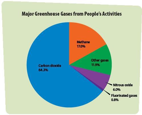 Antag att utsläppen består av 1 % metan och 99 % koldioxid, samtidigt som metan ger 20 ggr starkare klimatpåverkan. Då betyder det att klimatpåverkan till 20 % kommer från metan och 80 % från koldioxid. Det är detta som ditt diagram visar, fast med de riktiga värdena. Mina siffror var bara ett exempel.