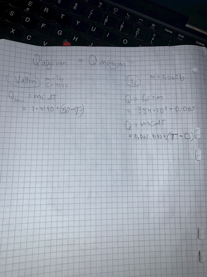 ”1 liter vatten av temperaturen 50 grader celsiuscupen blandad med 65g nollgradig is. Vilken blir blandningens temperatur då all is har smält?”