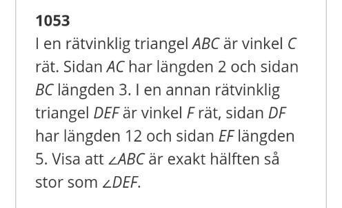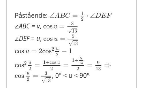 Jag måste nu kunna ställa upp ett samband som visar att <ABC är exakt hälften så stor. Hypotenusan på den minsta är √13 och på den största är den 13. I facit står det såhär: