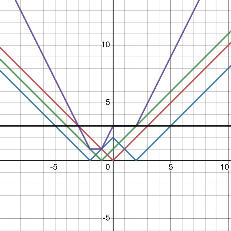 Röd är y = |x|, blå är y = ||x|-2|, grön är |x+1| och det lila är den funktion.