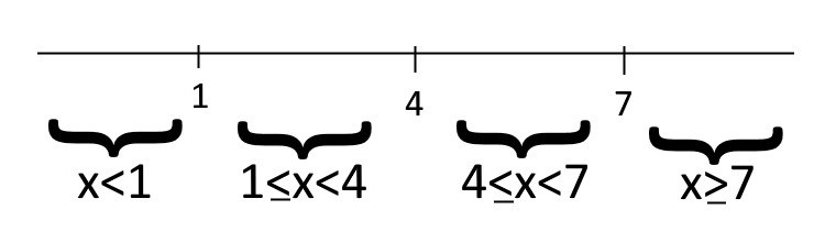 Gör man så för alla absolutbelopp får man fyra "intervaller". Enklast att se intervallerna när man skriver upp de på en tallinje: