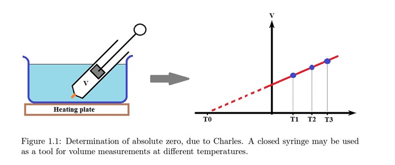 Charles lag beskriver att sambandet mellan en volymen av en gas och temperaturen är direkt proportionellt (med vissa antaganden). På så vis kan du utgå ifrån den uppmätta volymen vid kända temperaturer (motsvarande röda linjen) och följa den räta linjen till en okänd temperatur (streckade linjen).