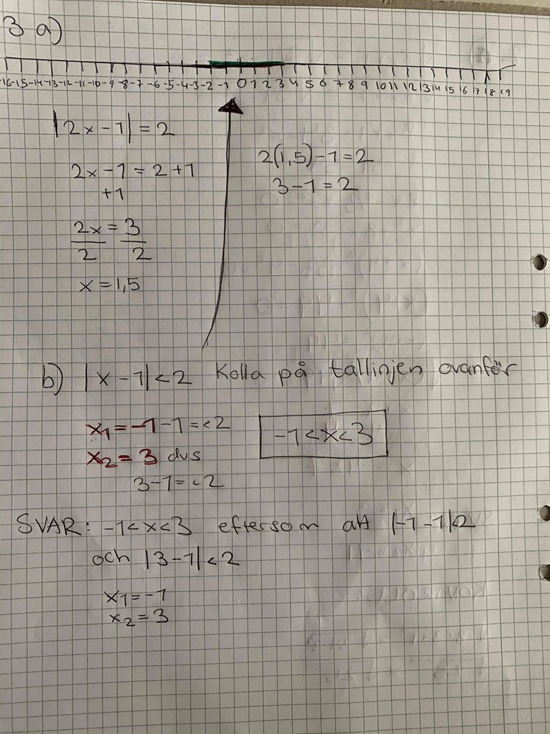 mattegeni1 skrev:Tigster skrev:Hur skulle du löst uppgiften om det stod |x - 1| = 2 istället? Kan du markera det på tallinjen?ja 3-1=2 men det står att det ska vara MINDRE än 2?