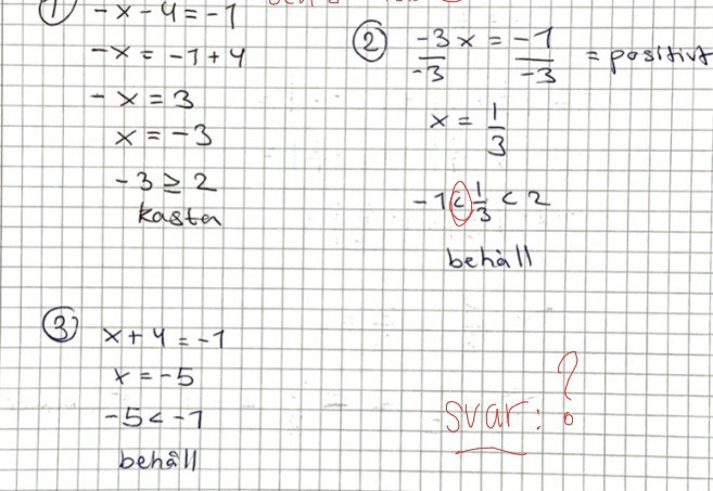 Svar: Fall 1 skall kastas då -3 inte är större än 2 och fall 2 stämmer för att -1≤1/3<2 samt fall 3 behåller vi också eftersom -5<-1 ?