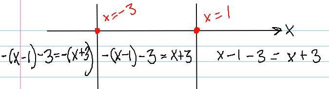Det betyder att om x < 3 så kan vår ekvation skrivas -(x-1) - 3 = -(x+3).