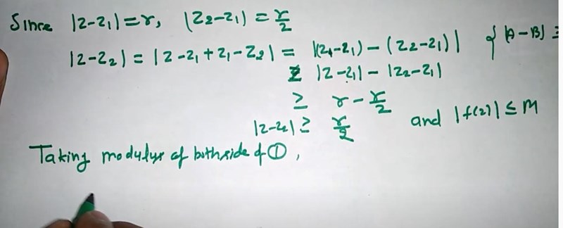 Jag förstår inte riktigt hur de har kommit fram till att abs (z-a) ≥ r/2 och abs(z-b)≥r/2? Man kan sätta r≥2 max (a, b) och abs (z)= r men sen vet jag inte hur de har räknat fram.