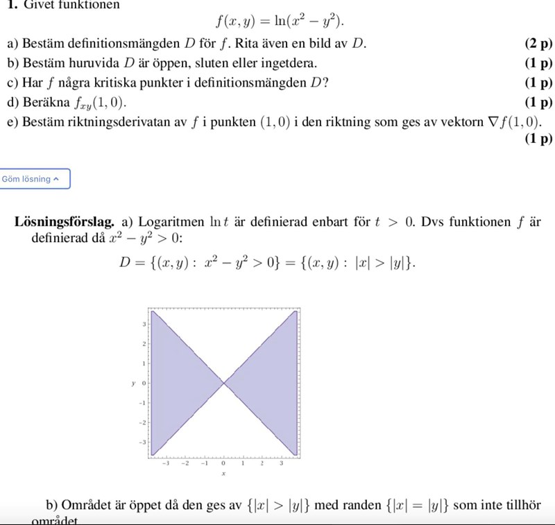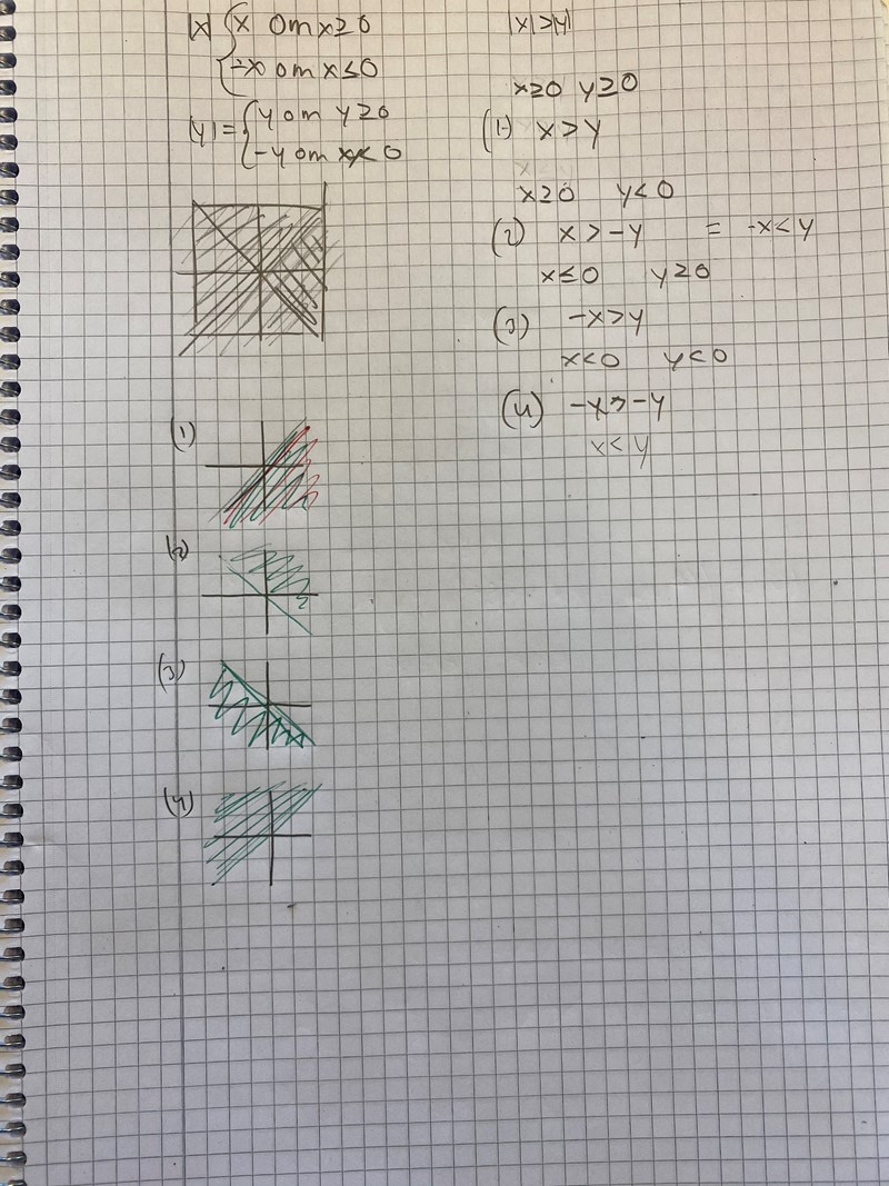 Hejsan! Har lite svårt att förstå abs(x) och abs(y) förhållanden till varandra. Typ om abs(x)>abs(y) eller abs(x)<abs(y), förstår inte logiken bakom eller varför skissen ser ut så när jag skriver ut den på desmos exempelvis. Det är i denna fråga nedan jag fastnade på, så därför undrar jag också varför man området ser ut så på den. Tänkte först att det kunde bli en cirkel -(x^2 + y^2)>0 men så var det icke...