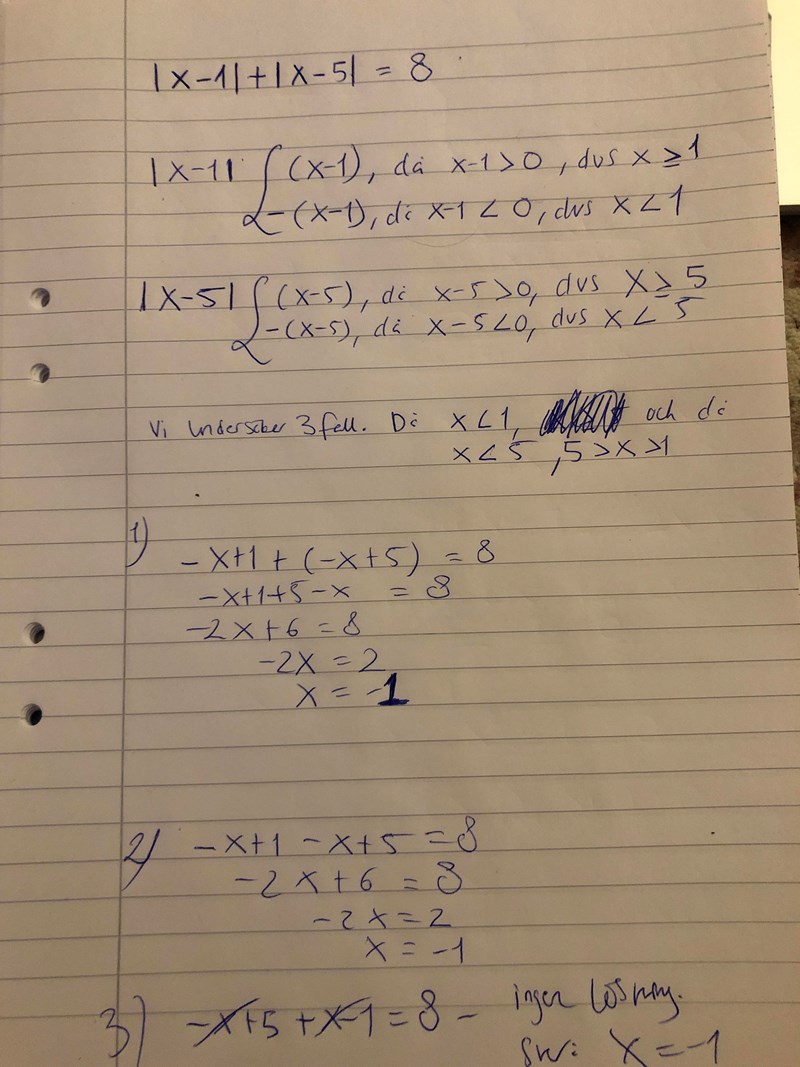 Kommer fram till att x=-1 och x=7