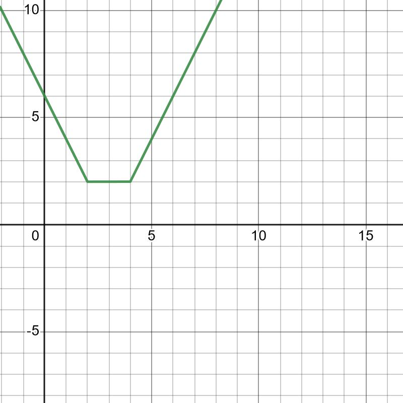 Här har du grafen för f(x) = |x-2|+|x-4|. Det är inte rätt funktion, men du kan kanske jobba vidare från den?