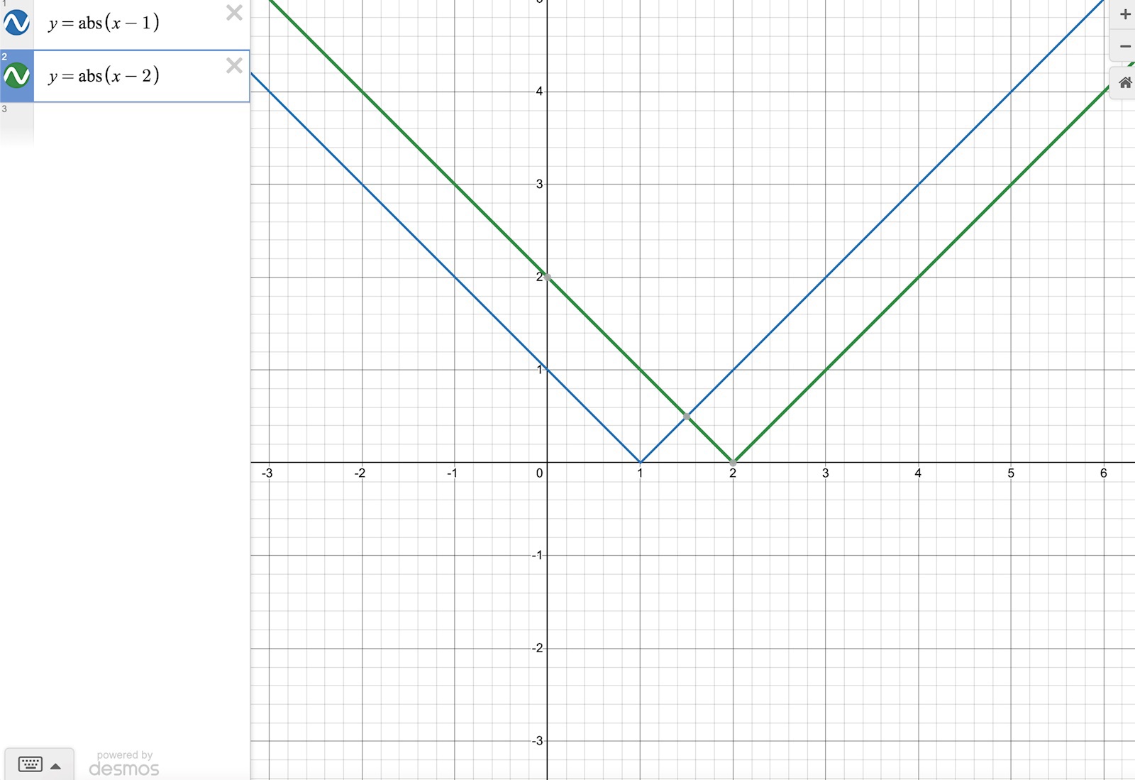 Om man ritar ut graferna till | x - 1 | och y = | x - 2 | blir det såhär: