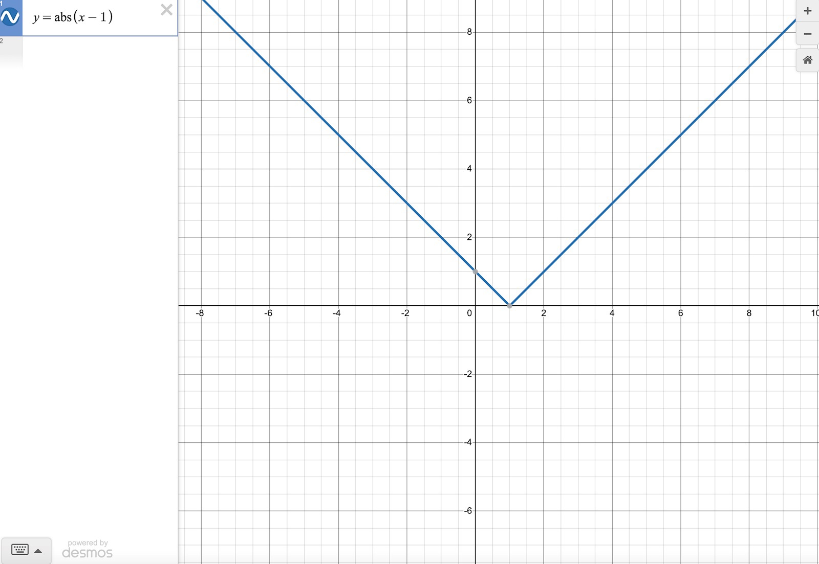 Alltså har konstanten c "förskjutit" kurvan till y = | x | c åt höger. Betrakta grafen nedan till y = | x-1 |: