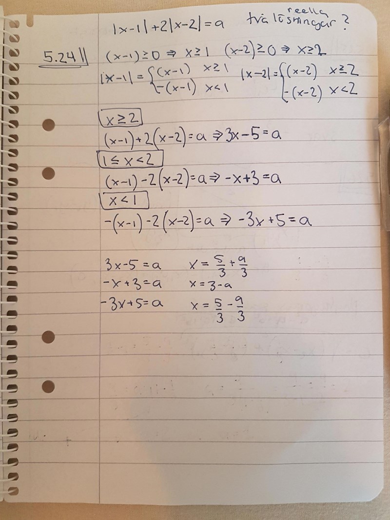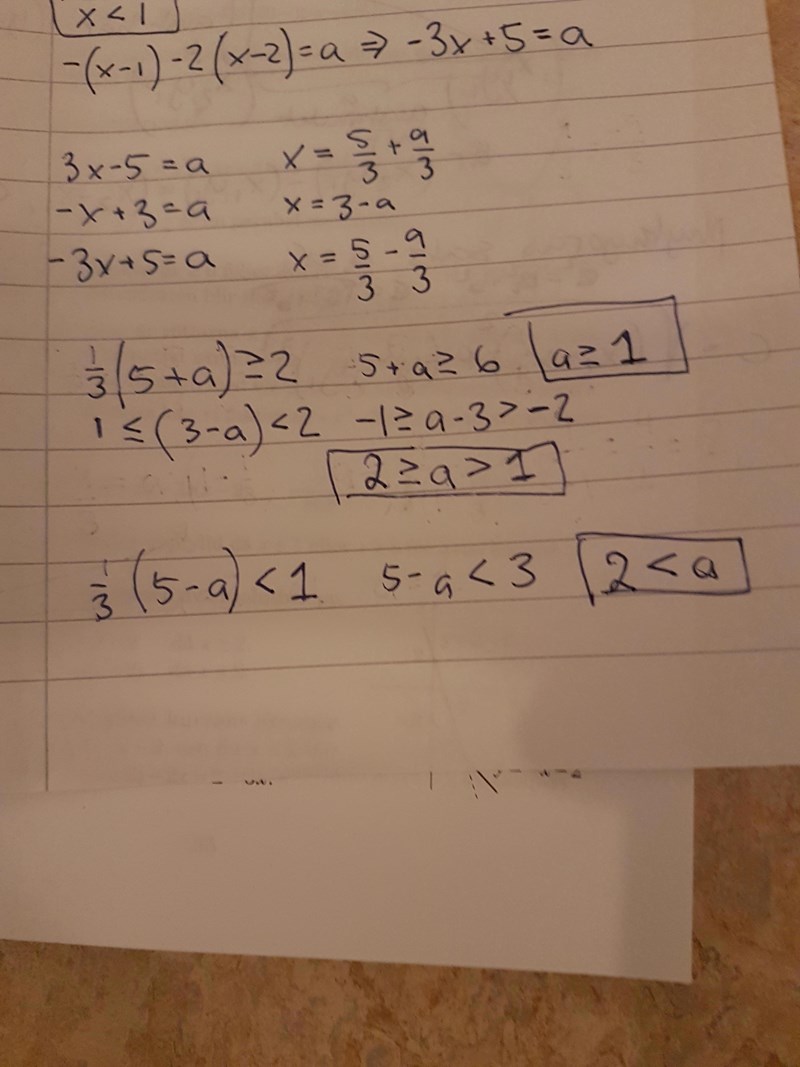 • För kravet x<1x <> har du kommit fram till att x=(5-a)/3x = (5-a)/3. För att detta ska vara en tillåten lösning måste talet (5-a)/3<1.(5-a)/3 <>