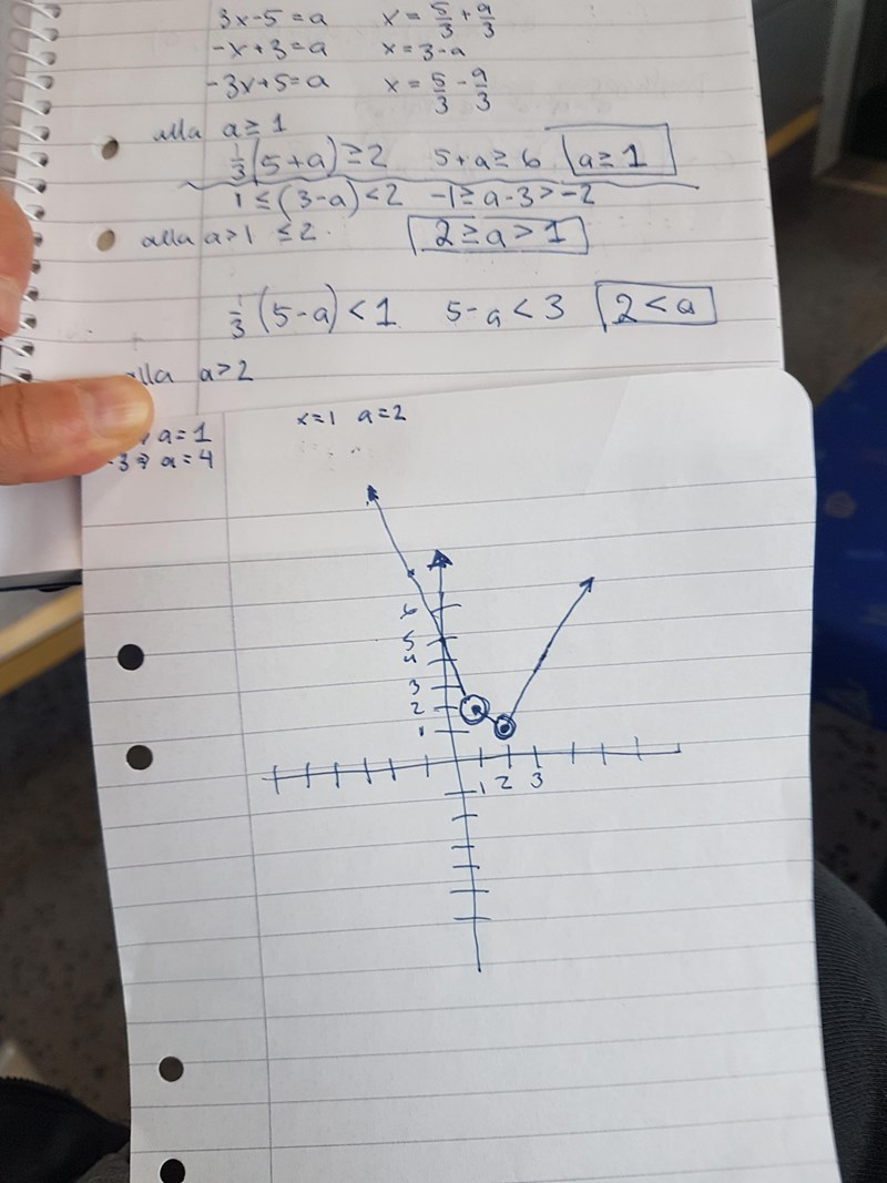 • För kravet 1x<21\leq x <> har du kommit fram till att x=3-a.x = 3-a. För att detta ska vara en tillåten lösning måste talet 3-a3-a uppfylla dubbelolikheterna 13-a<2.1 \leq 3-a <>