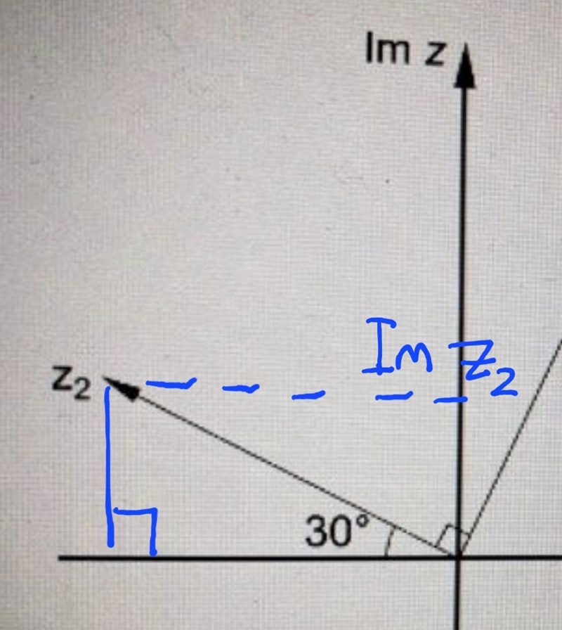 Det gäller att sin(30°) = | z2|/|z2|, se bild.