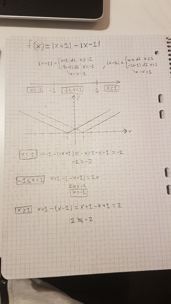 Yngve skrev:poijjan skrev:f(x) är ju -2 när x=-1 (enl ritad graf) , vilket jag får ut i en av lösningarna, men kollar jag på grafen borde jag även få ut x=1 som en lösning.. Men kollar jag lösningarna i de andra två intervallen så verkar grafen vara felritad.. kan någon hjälpa till att reda ut vart det blir fel här ?