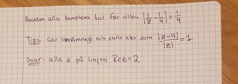 Du behöver inte följa tipset. Likheten beskriver komplexa tal () som befinner sig på cirkeln med centrum i punkten och radien . Sådana tal skrivs på blandad form som eller på rektangulär form som