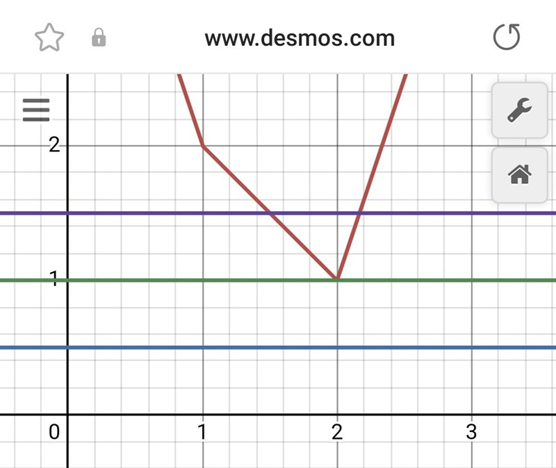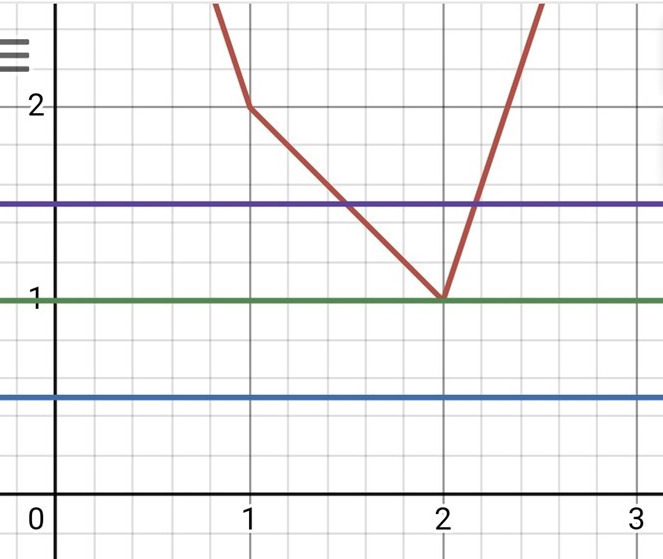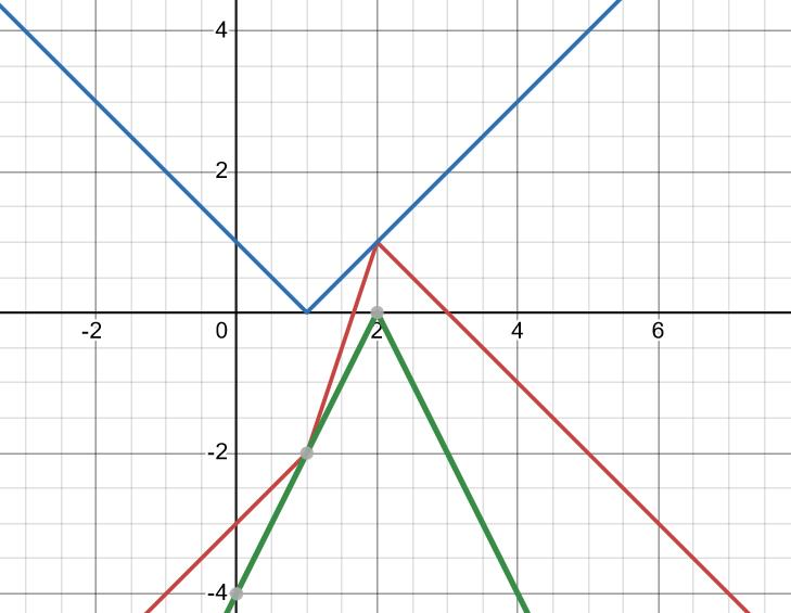EDIT: Det är den röda linjen som gäller, de andra är |x-1| respektive -2|x-2|. Jag ritade inte in någon linje a = y, du kan nog ändå se vilka värden på a som ger två skärningar med den röda kurvan.