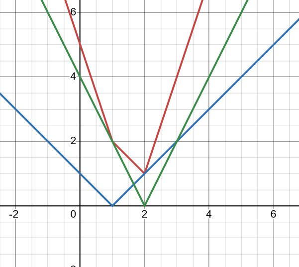 Om x > 2 så är vänsterledet |x-1|+2|x-2| = x-1+2(x-2) = 3x-5. [3]Linjen [1] har sitt minsta värde y = 2 för x = 1.