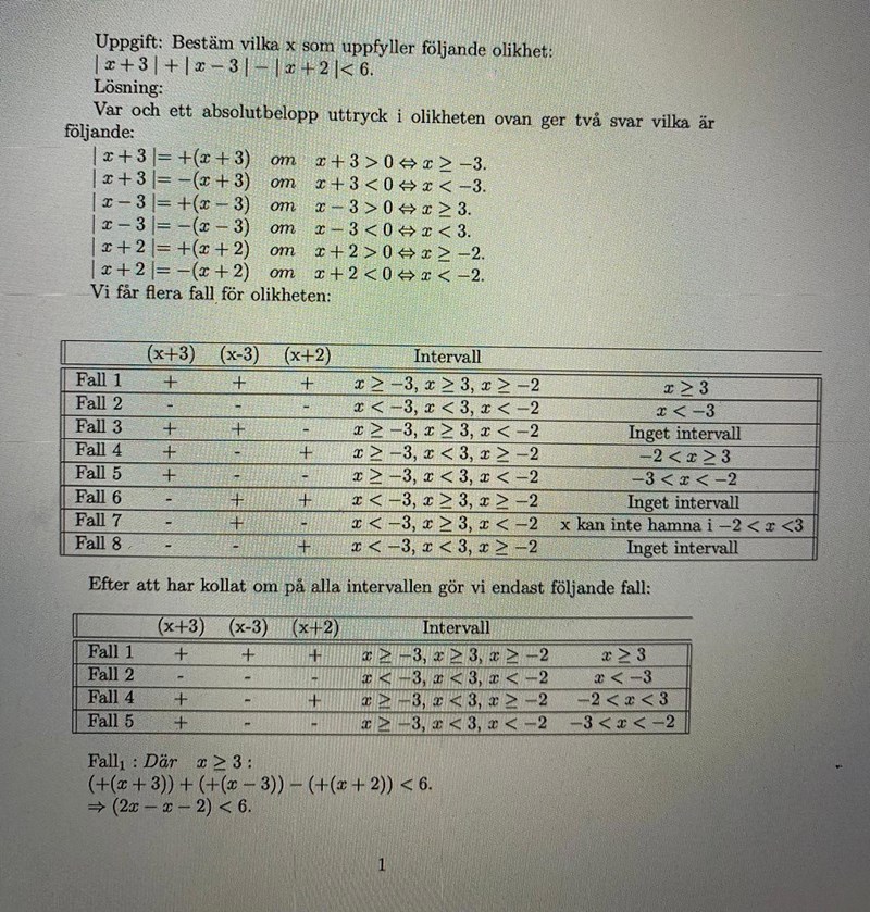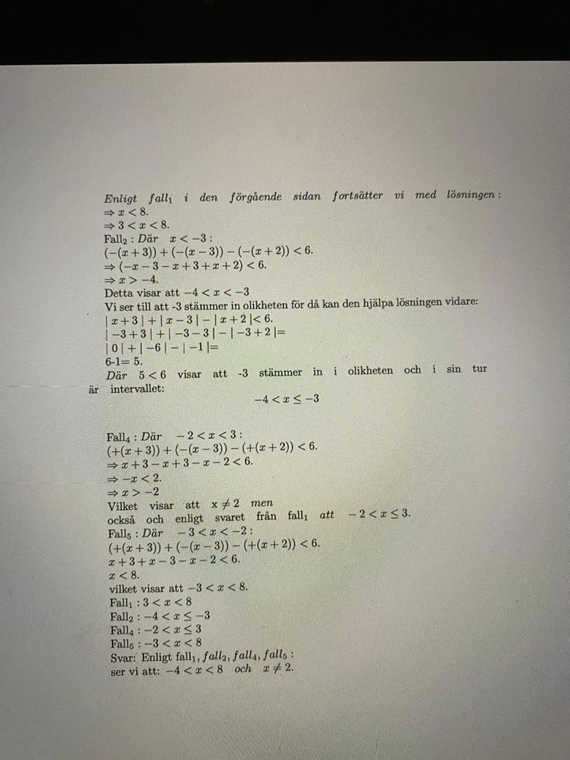 I fall 5 är slutsatsen -3 < x < 8 inte giltig, för intervallet gick bara upp till -2. Det påverkar dock inte svaret, för de andra värdena får man från de andra fallen.