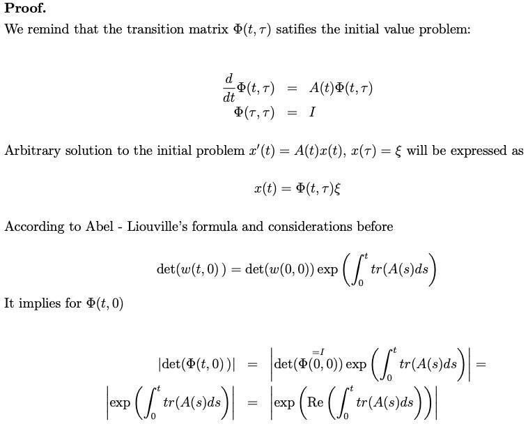 Hej, på bilden är en del av ett bevis där man visar att en monodromy matrix har ett egenvärde > 1 omm integralen av spåret för A(t) mellan 0 och p [A(t) = A(t+p)] är större än 0.