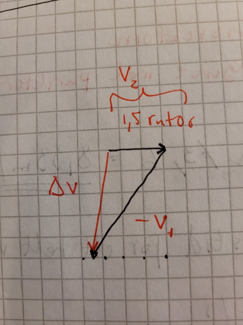 V2 har 2,5 rutor (skrev fel på min bild). Så om vi säger att vi börjar med v2 så hamnar spetsen åt höger och "svansen" på v2 börjar där v1 slutade. SEB drog jag resultaten (delta v) från början till slutet. Men tydligen är allt fel.
