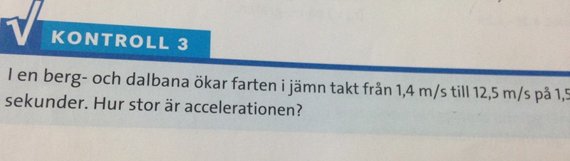 Detta beror på att den naturliga positiva riktningen för en berg- och dalbana är framåt och då skulle både fart och hastighet öka från 1.4 till 12.5 m/s och uträkningen skulle då bli (12.5 - 1.4)/(1.5 - 0) = 7.4 m/s^2.