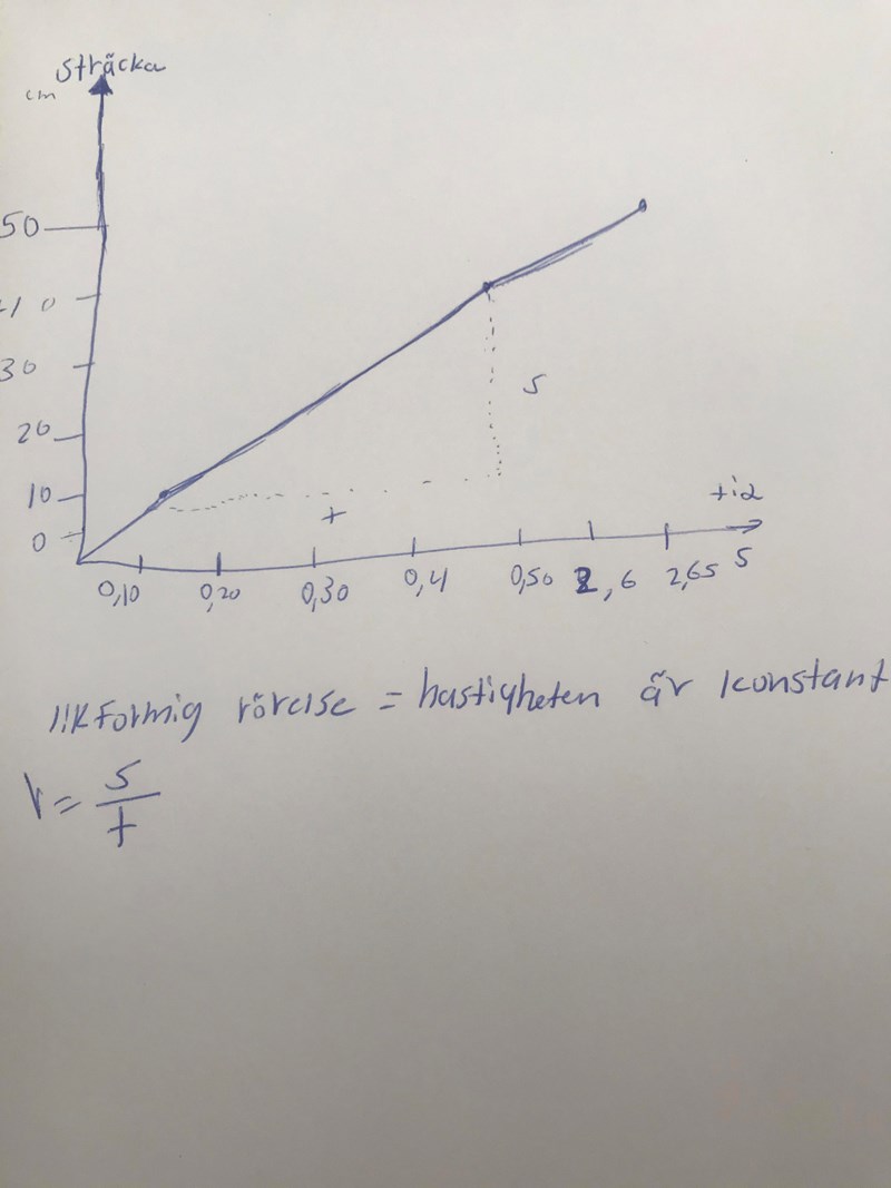 Vi hade en bok under en pärm och en bok på andra sidan.sen vi använde en linjal för att mäta sträckan i en ränna för att mäta varje tio cm. Sen vi rörde en kulan mot den längden som vi har gjort och samtidigt vi mäter sekunder och skriver i tabellen