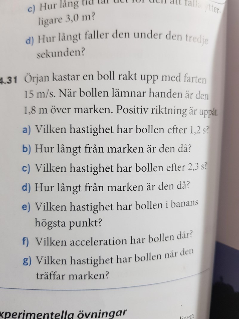 Vilken uppgift? om det är 4.31 så finns det ju 7 uppgifter så jag har ingen aning om vilken du syftar på. Man brukar räkna med att om ett objekt rör sig i positiv y-axel är det positivt och negativ y-axel är det negativt. g verkar mot negativ y-axel så man brukar säga att g=-9.82 men du hade likaväl kunnat vända på det. Om du gör det så är g=9.82 och hastigheten för ett kast rakt uppåt har då en negativ hastighet. Du kan välja vilket håll som är positivt och negativt med andra ord så länge du är konsekvent.