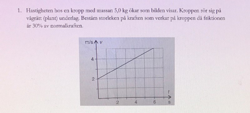 Du kan dela upp den totala kraften på kroppen i två delar - en som motverkar friktionen och en som får kroppen att accelerera. Kraften som accelererar kan räknas ut genom formeln F = ma. Du vet m, och a kan du läsa ut av diagrammet. Kraften som motverkar friktionen är lika stor som friktionskraften, så den har du redan räknat ut.