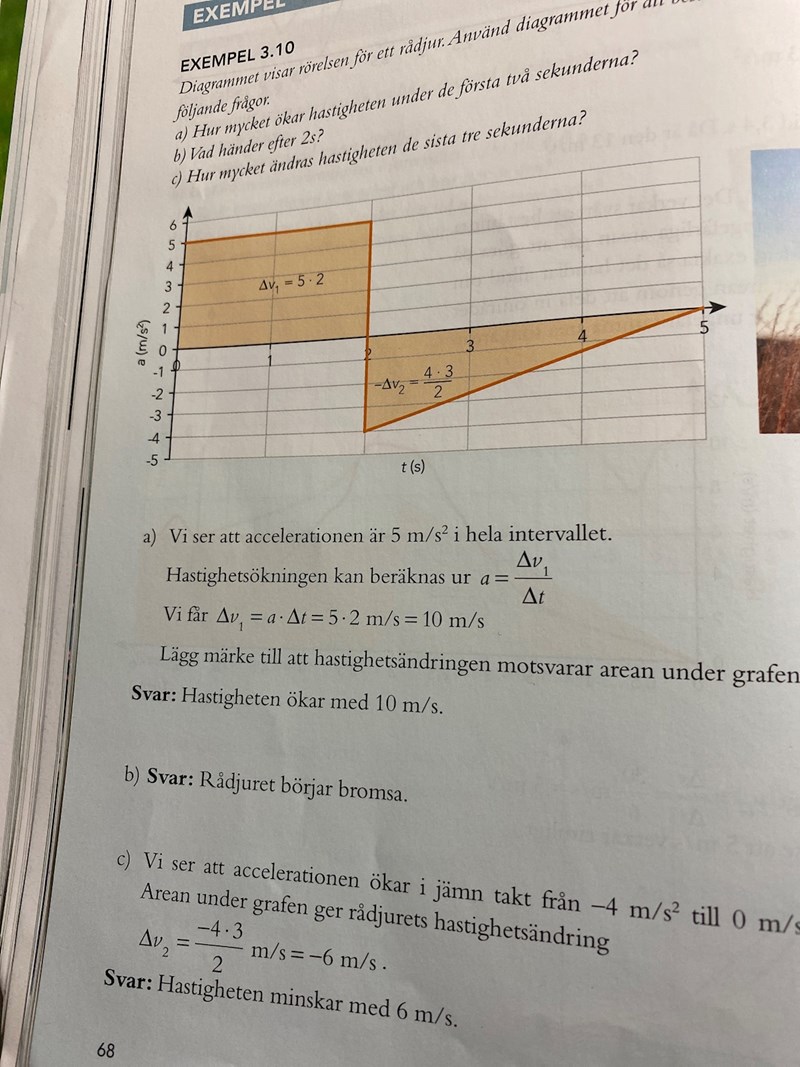 Hej, jag har en fråga! Enligt grafen beräknas hastigheten för fråga c genom att räkna -4•3/2. Men varför ska jag dela på 2? Om man beräknar sträckan så räknar man arean för området. Men för att beräkna hastigheten skall man väl bara göra acceleration•t=v?