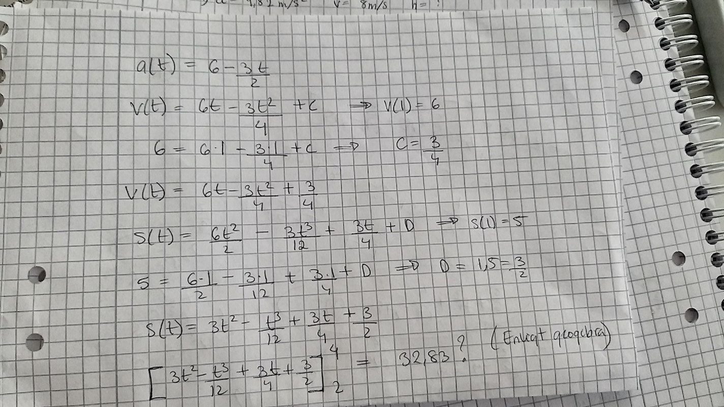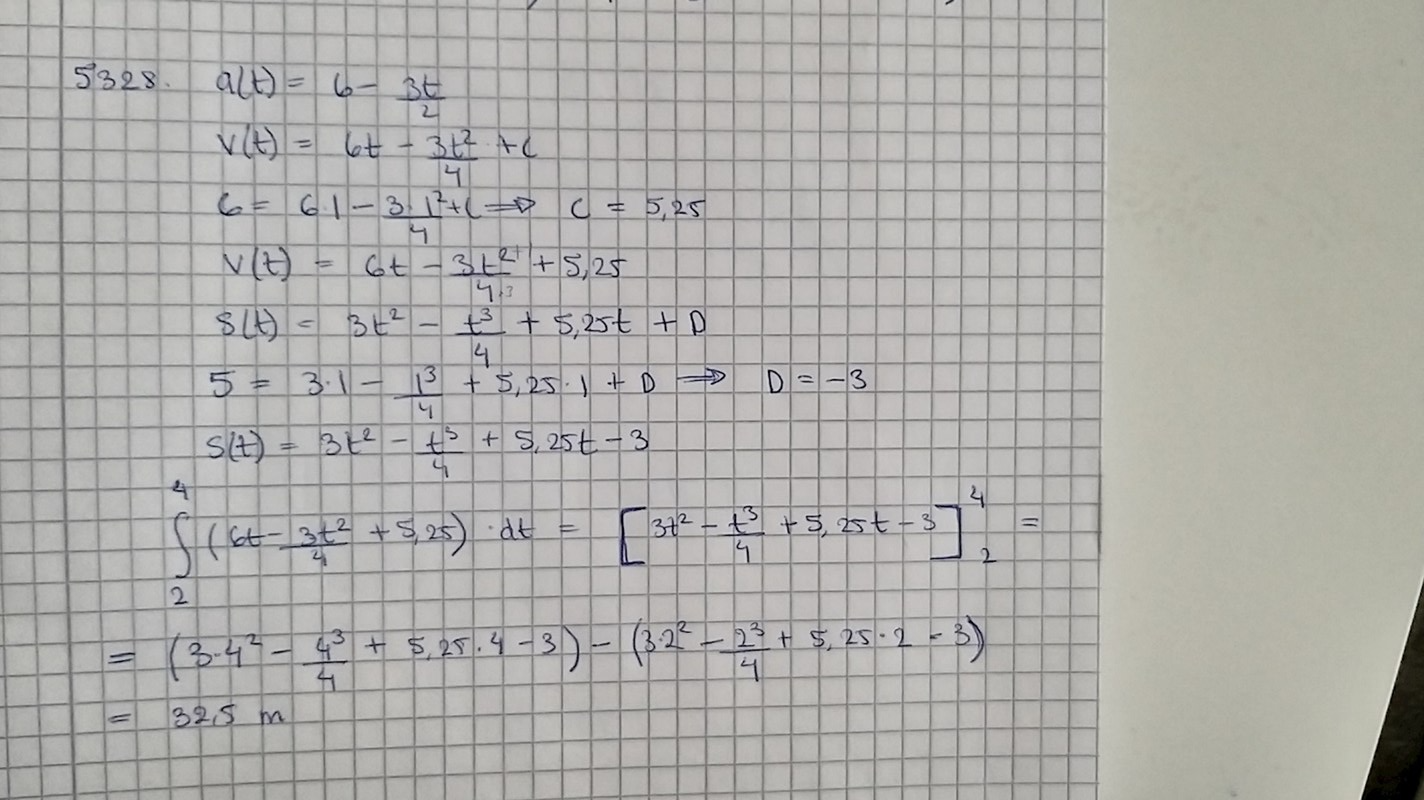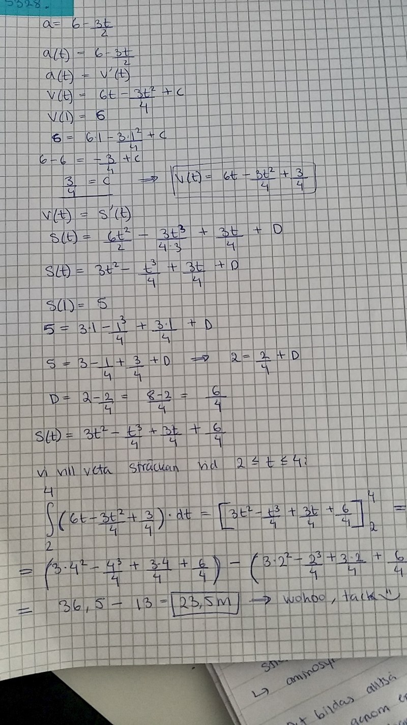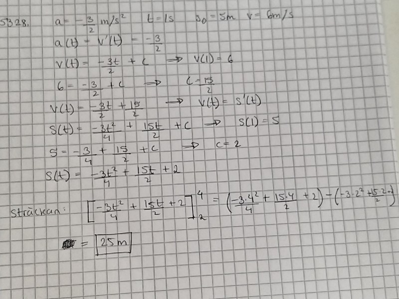 Jag löste frågan igen men det blir fel igen...(facit säger att det är 23,5 m, jag får 32,5 m, har även provat att integrera min funktion för hastigheten i Geogebra och svaret blir 32,5 m där också).