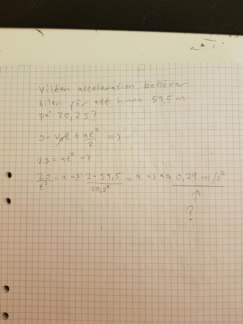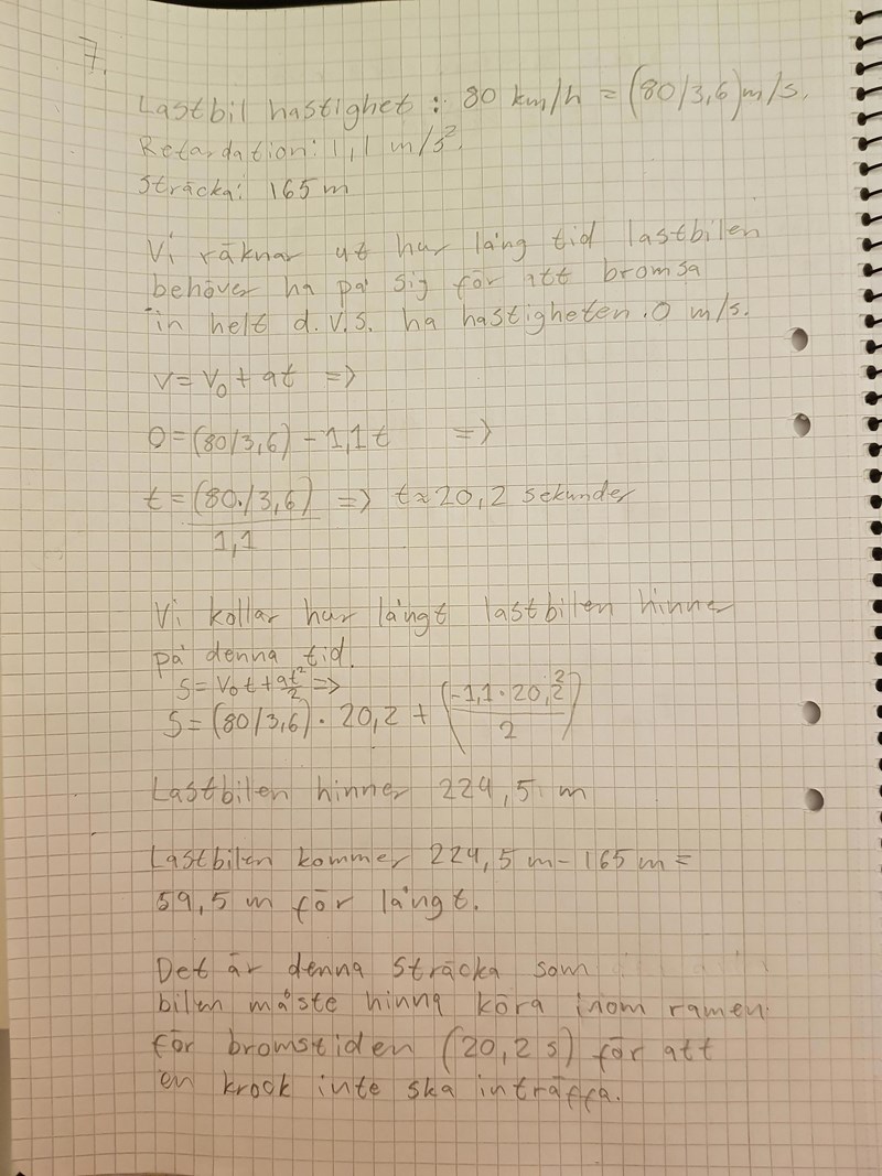 i lastbilen en stillastående bil framför sig. Lastbilen börjar genast bromsa med den konstanta accelerationen 1,1 m/s². Avståndet mellan lastbilen och bilen är då 165 m. Samtidigt som lastbilen börjar bromsa så börjar bilen att accelerera konstant för att undvika en krock. Vilken måste bilens minsta acceleration vara om en krock ska undvikas?