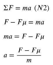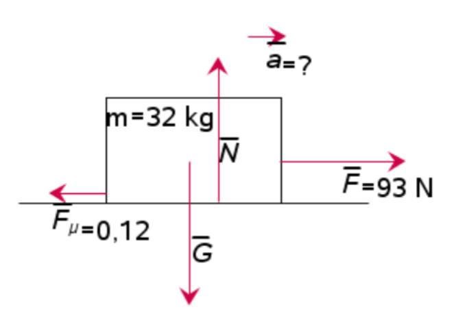 Vilken acceleration har en kropp med massan 32 kg, då den utsätts för dragkraften 93 N? Rörelsefriktionstalet är 0,12.