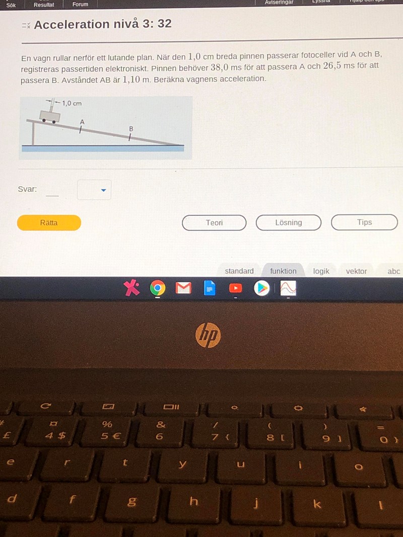 Det står i texten: Pinnen är 1,0 cm bred. Det tar 38,0 s för pinnen att passera A och 26,5 s för pinnen att passera B. Vagnen hinner alltså röra sig 1,0 cm på 38,0 resp 26,5 ms.
