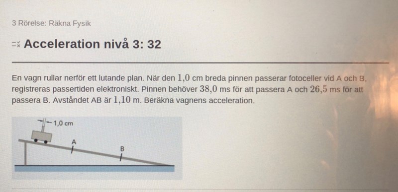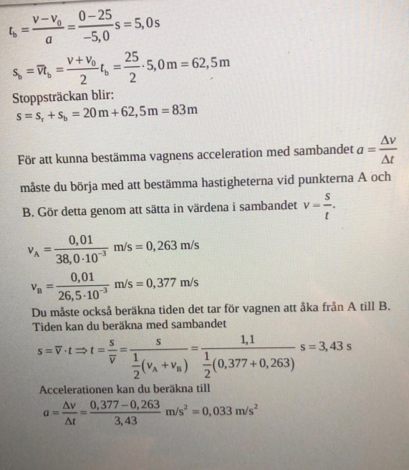För att beräkna accelerationen enligt definitionen måste du veta hastghetsändringen och på vilken tid denna skett. Om accelerationen är konstant som i detta fall (kraften är konstant) ändras hastigheten linjärt och du kan beräkna tiden utgående från medelhastigheten, dvs (va+vb)/2.